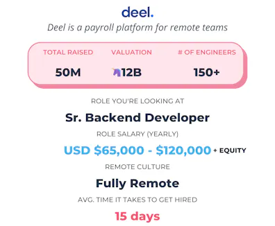DEEL is valued at $12 Billion dollars. With more than 130 engineers, you'll be joining an increasingly growing, fast-paced engineering team.